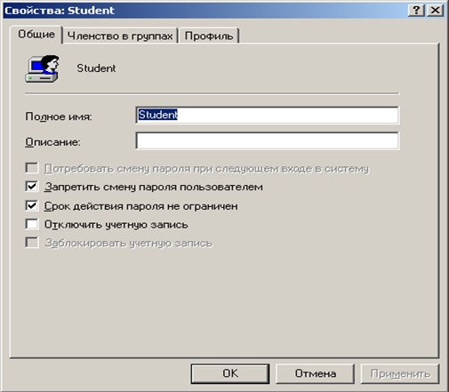 ![]() Рисунок 1. — Окно консоли Управление компьютером а) в меню Действие выбрать команду Новый пользователь; ![]() Рисунок 2. — Диалоговое окно Новый пользователь в) Установить или снять перечисленные ниже флажки: г) Выполнить одно из следующих действий: Имя пользователя не может состоять только из точек и пробелов. В поля Пароль и Подтверждение может быть введен пароль, содержащий до 128 символов. Однако, если компьютер с Windows XP Professional используется в сети, к которой подключены компьютеры, работающие под управлением Windows 95 или Windows 98, необходимо предусмотреть использование паролей не длинней 14 символов. Windows 95 и Windows 98 поддерживают пароли длиной до 14 символов. Если пароль имеет большую длину, войти в сеть с этих компьютеров не удастся. Если новый пользователь будет выполнять не только административные задачи, его не следует добавлять в группу «Администраторы». 2. Изменение свойств учетных записей пользователейНабор свойств по умолчанию связан со всеми доменными и локальными учетными записями. Свойств у первых больше, чем у вторых. Свойства локальных учетных записей представляют собой подмножество свойств доменных учетных записей. Чтобы изменить локальную учетную запись, в оснастке Computer Management (Управление компьютером), необходимо выбрать Local Users And Groups (Локальные пользователи и группы) и дважды щелкнуть объект, свойства которого нужно изменить.Диалоговое окно свойств (рисунок 3.) содержит для всех учетных записей набор вкладок, позволяющих настраивать свойства для определенного пользователя. К локальным учетным записям относятся вкладки: