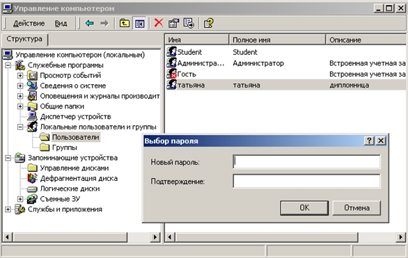 ![]() Рисунок 3. — Диалоговое окно свойств Администрирование учетных записей пользователей включает изменение учетных записей и настройку пользовательских профилей и домашних каталогов. Чтобы изменить учетную запись пользователя необходимо: a) открыть компонент Управление компьютером; Интересы предприятия могут потребовать изменения учетных записей, скажем, переименовать учетную запись для нового сотрудника так, чтобы он имел полномочия и доступ к сети своего предшественника. Другие изменения, например, отключение, подключение и удаление учетной записи касаются персональных изменений или личной информации. Может потребоваться и восстановление пароля или разблокирование учетной записи. Можно производить следующие действия: а) отключение/включение. Учетную запись следует отключать, когда пользователю в течение длительного времени она будет не нужна, но понадобится в будущем; Для процедур отключения, включения, переименования и удаления локальных учетных записей используется расширение Local Users And Groups (Локальные пользователи и группы) оснастки Computer Management (Управление компьютером). Чтобы отключить или активизировать учетную запись пользователя необходимо: а) открыть компонент Управление компьютером; Для отключения или активизирования учетной записи гостя необходимо войти в систему с учетной записью «Администратор» или члена группы «Администраторы». Отключенная учетная запись продолжает существовать, но пользователю запрещен вход в систему. Она появляется в области сведений, но ее значок помечен крестиком (Х). При активизации учетной записи пользователь получает возможность обычного входа в систему. Чтобы удалить учетную запись пользователя необходимо: а) открыть компонент Управление компьютером; Когда необходимо удалить учетные записи пользователей, рекомендуется сначала отключить учетные записи. Убедившись, что отключение учетной записи не вызвало неполадок, можно благополучно удалить ее. Удаленную учетную запись пользователя восстановить невозможно. Невозможно удалить встроенные учетные записи администратора и гостя. Встроенную учетную запись администратора отключить невозможно. 3. Смена паролейЕсли пользователь не может зарегистрироваться на локальном компьютере, то может потребоваться смена его пароля или разблокирование его учетной записи. Для этого надо иметь административные привилегии для организационного подразделения, к которому относится данная учетная запись. Если срок действия пароля истечет до того, как его изменят, или пользователь забудет свой пароль, то надо сменить пароль. Чтобы изменить пароль для пользователя необходимо: а) открыть компонент Управление компьютером; ![]() Рисунок 4. — Окно замены пароля 4. Профиль пользователяПрофиль пользователя — это набор папок и данных, определяющих параметры рабочего стола, приложений и место хранения личных данных. Профиль также содержит все сетевые соединения, установленные при входе в систему, пункты меню Start и драйверы, относящиеся к сетевым серверам. Профиль пользователя сохраняет вид рабочего стола и параметры среды, заданные во время последнего входа в систему. Windows XP Professional создает профиль локального пользователя при первом входе в систему. Профиль пользователя функционирует следующим образом: а) при входе в компьютер с Windows XP Professi