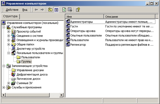 2) обязательный профиль. Так называют RUP «только для чтения». Пользователь по-прежнему может изменять параметры своего рабочего стола, но при выходе из системы эти изменения не сохраняются. При его следующем входе обязательный профиль снова загружается с сервера. Можно назначить один обязательный профиль многим пользователям, которым нужны одинаковые параметры рабочего стола. Изменив один профиль, изменится рабочая среда нескольких пользователей. Чтобы сделать профиль обязательным («только для чтения»), нужно изменить расширение файла Ntuser в каталоге профиля на сервере с .dat на .man. Чтобы настроить перемещаемый и обязательный профили пользователей в сети должен быть сервер, который будет хранить папку с файлами профилей. Так как в одноранговой сети не имеется сервера, то настроить перемещаемый и обязательный профиль невозможно. В такой сети можно лишь настроить локальный профиль пользователя каждого компьютера. 5. Администрирование учетных записей группГруппа (group) — это набор учетных записей пользователей. Группы упрощают администрирование, позволяя назначать разрешения и права группе пользователей, а не каждой отдельной учетной записи. Пользователи могут быть членами нескольких групп. Назначая разрешения, пользователям предоставляется доступ к определенным ресурсам и определяются права доступа. Если, например, нескольким пользователям требуется считать один файл, можно добавить их учетные записи в группу. Затем дать группе разрешение на считывание файла. Права дают возможность выполнять системные задачи, например, изменять системное время, архивировать или восстанавливать файлы, а также локально регистрироваться в системе. Кроме пользователей, в группу можно добавлять контакты, компьютеры и другие группы. Добавляя компьютеры в группу, можно упростить предоставление доступа системной задаче одного компьютера к ресурсам другого. Локальная группа может включать учетные записи компьютера, на котором она находиться. Ее рекомендуется применять для назначения разрешений доступа к ресурсам, расположенным на том же компьютере, что и группа. Windows XP создает локальные группы в локальной базе данных системы защиты. Локальные группы бывают доменными и изолированными. Необходимо помнить следующее: а) локальные группы домена создаются в хранилище Active Directory и используются всеми контроллерами данного домена. Локальной группе домена можно предоставить разрешения доступа к любому ресурсу на контроллерах домена; 5.1 Создание локальных группЛокальные группы позволяет создать оснастка Computer Management (Управление компьютером). Локальные группы создаются в папке Groups (Группы). Чтобы создать локальную группу необходимо: а) раскрыть в дереве консоли папку Local Users And Groups (Локальные пользователи и группы); Параметры диалогового окна New Group (Новая группа): а) Group Name (Имя группы) — уникальное имя локальной группы. Это единственный обязательный параметр. В имени можно использовать любые символы, кроме «\». Длина имени не может превышать 256 символов, однако в некоторых окнах слишком длинные имена отображаться не будут; ![]() Рисунок 5. — Диалоговое окно Новая группа 5.2 Встроенные локальные и системные группыНа всех изолированных и рядовых серверах и компьютерах с Windows XP Professional есть встроенные локальные группы. Они предоставляют разрешения на выпо
