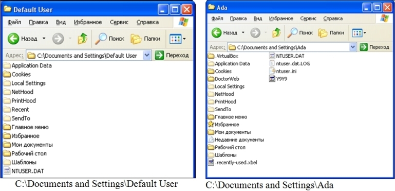 Структура профиля пользователяПрофиль пользователя создается на основе профиля, назначаемого по умолчанию. Он имеется на каждом компьютере, где работает Windows XP. Файл NTUSER.DAT, находящийся в папке Default User, содержит настройки конфигурации, хранящиеся в реестре Windows XP. Кроме того, каждый профиль пользователя использует общие программные группы, находящиеся в папке All Users. Папка Default User, папки профилей индивидуальных пользователей, а также папки All Users, HelpAssistant (появляется при использовании удаленного помощника), LocalService и NetworkService находятся в папке Documents and settings корневого каталога на загрузочном томе. На рис. 7. показана структура папок локального профиля пользователя. ![]() Рисунок 7. — Структура папок локального профиля пользователя. В табл. 2 перечислены подпапки, находящиеся внутри папки локальной профиля пользователя, и описано их содержимое. Некоторые из этих подпапок являются скрытыми и могут быть не видны при обычном просмотре. Все указанные папки, кроме папки Local Settings, входят в перемещаемый профиль пользователя (при работе компьютера в составе домена). При использовании обычного профиля локальные папки Application Data, Рабочий стол (Desktop), Мои документы (My Documents), Мои рисунки (My Pictures) и Главное меню (Start Menu) можно переназначать на общие сетевые диски при помощи оснастки-расширения Перенаправление папки (Folder Redirection), входящей в оснастку Групповая политика (Group Policy).