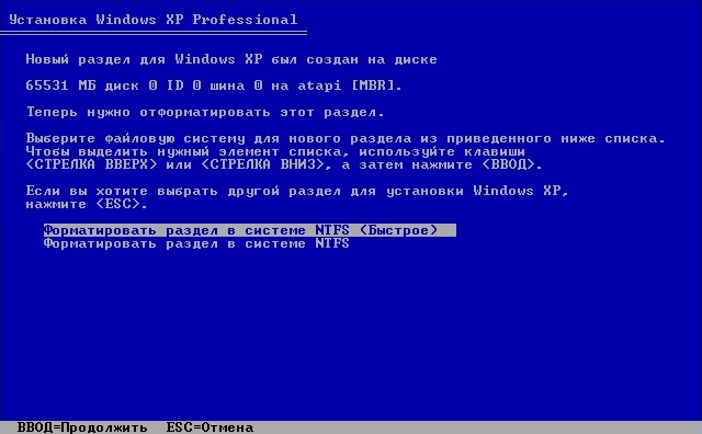 Окно выбора файловой системы NTFS/FAT32 в зависимости от версии Windows XP