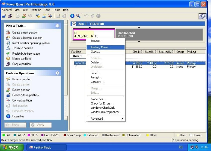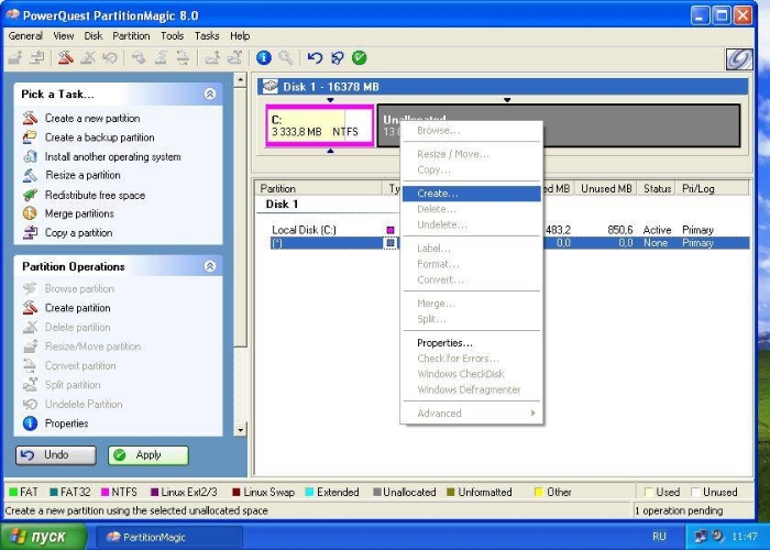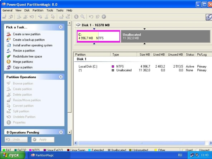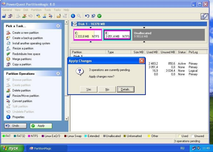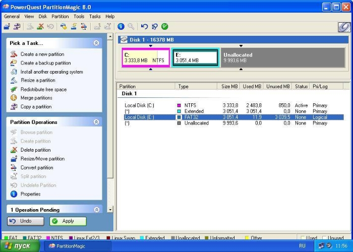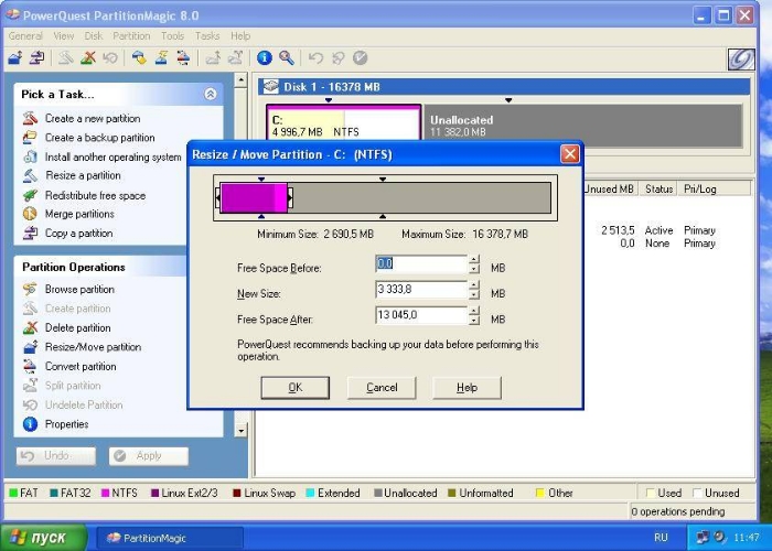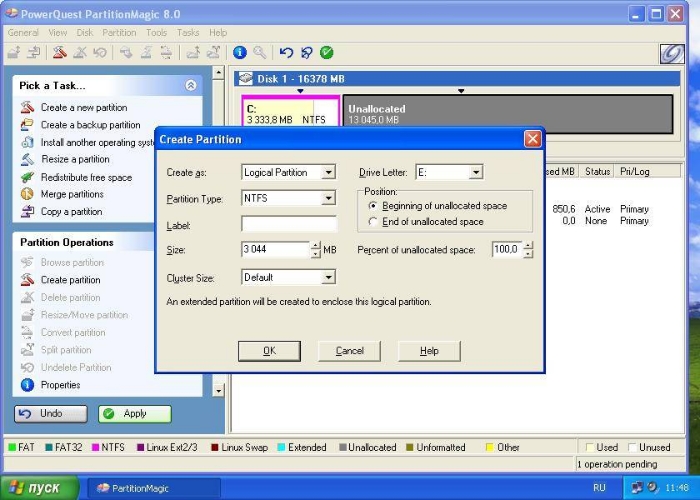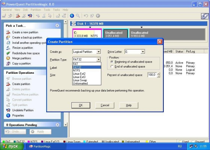Практическая работа 6. Файловые системы Windows XPРазделение логического диска формата NTFS и дальнейшее его преобразование в формат FAT32 c помощью программы PartitionMagic 8.0.![]() Запускаем программу: ![]() В окне видим логические разделы жесткого диска. Щелкаем правой кнопкой мыши на раздел С (выбираем Resize/Move) или выбираем в левом меню действие «Resize a partition» ![]() Уменьшаем объем ЖД с помощью динамического скроллера, или задавая размер вручную. ![]() ![]() Далее выделяем пустую область, щелкаем правой кнопкой мыши, выбираем действие «Create». ![]() Задаем размер раздела. ![]() Выбираем формат «FAT32» ![]() В левом нижнем углу нажимаем на кнопку «Apply» ![]() Программа спрашивает, уверены ли мы в своих действиях, жмем «Yes» ![]() Так как мы работали над системным диском в режиме загруженной ОС, то программа не сможет выполнить всех действий, поэтому потребуется перезагрузка; соглашаемся. ![]() ![]() ![]() Конвертация логического раздела из формата FAT32 в NTFS без потерь.Пуск |