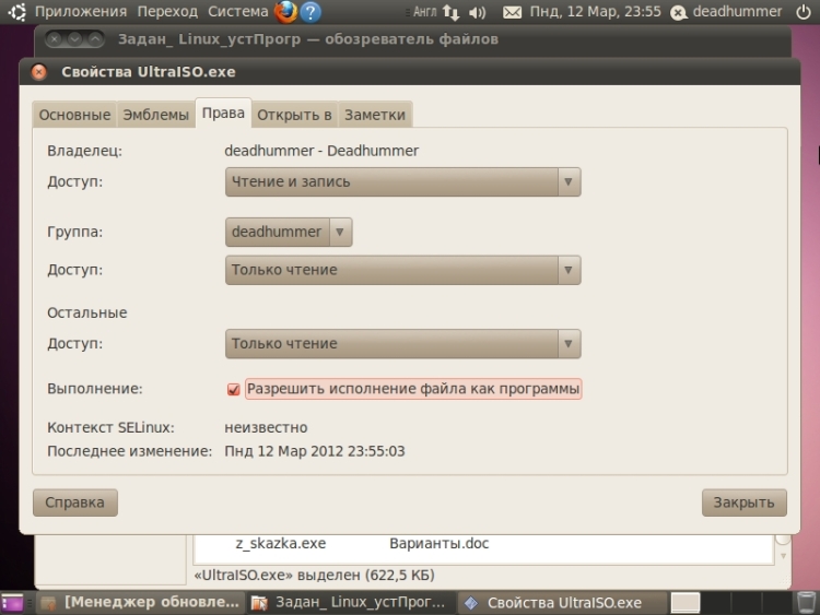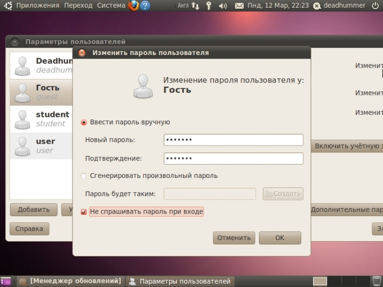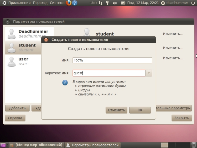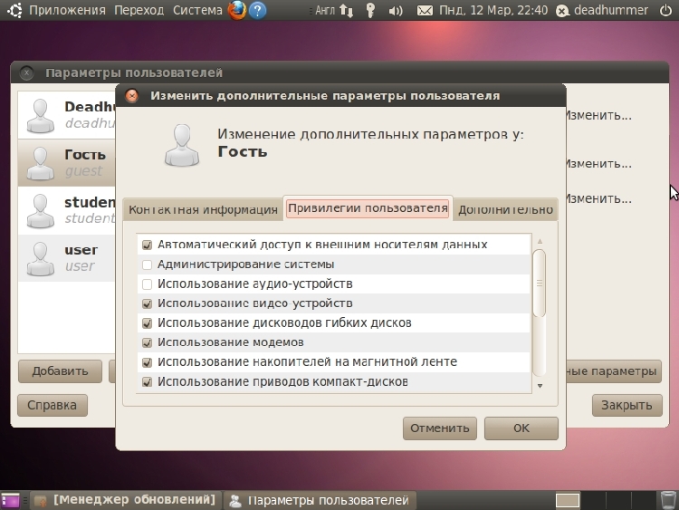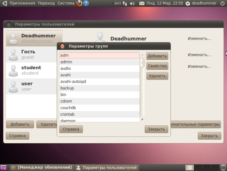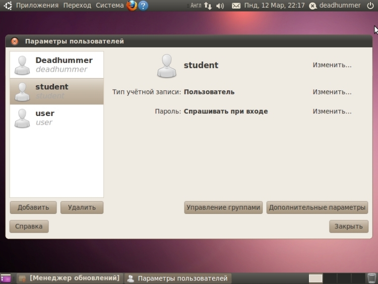 Практическая работа №2Установка и удаление программ через центр управленияУдаление.Для того чтобы удалить приложение открываем “Центр приложений Ubuntu” – меню «Приложения» ![]() Если вы хотите посмотреть дополнительную информацию о приложении, то нужно нажать кнопку «Подробнее». Там так же имеется кнопка «Удалить». ![]() Так же можно удалять программы с помощью менеджера пакетов Synaptic. Для этого переходим в меню «Система» ![]() Указываем пароль администратора (Обязательное действие.) Программа имеет множество параметров настройки, обновления и многого прочего. Нас же интересует Кнопка состяние и пункт «Установленные». Выбираем из списка требуемую программу или не требуемые элемент программы, нажимаем правой клавишей мыши и выбираем пункт «Отметить для удаления» или «Ометить для полного удаления» (Разница между ними в том, что при удалении удаляется запись о программе из центра приложений и меню, файлы программы не удаляются, либо удаляются частично; а полное удаление удаляет с диска файлы программы и ее конфигурационные файлы из папок конфигурации) ![]() Соглашаемся на данное действие и нажимаем кнопку «Применить». ![]() ![]() Для установки приложенийчерез менеджер пакетов Synaptic производим обратные действия. УстановкаДля того чтобы установить приложение открываем “Центр приложений Ubuntu” – меню «Приложения» ![]() ![]() ![]() После ввода пароля администратора начнется процесс установки. ![]() Также за процессом установки приложений можно наблюдать, нажав кнопку «В процессе». ![]() Практическая работа №3Создание пользователей и присвоение им правДля управления пользователями и группами переходим в меню «Система» ![]() Для добавления нового пользователя нажимаем кнопку «Добавить» в нижнем левом углу под списком пользователей, водим пароль администратора, затем вводим имя пользователя, при потребности изменяем короткое имя, и нажимаем «Ок», вводим пароль для учетной записи.