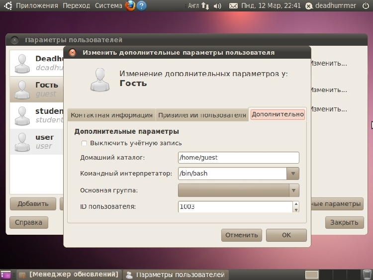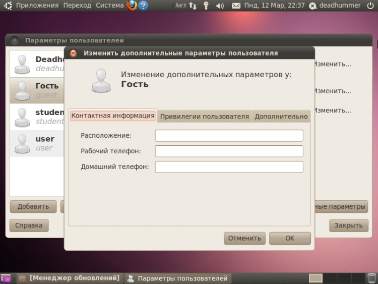 ![]() ![]() Пароль численно-буквенный, не менее 7 знаков, также система может сгенерировать пароль, главное записать его, так же можно настроить будет ли запрашиваться пароль при входе в систему из под этой учетной записи (для внесения изменений нужно будет вводить пароль). Теперь можно настроить созданную учетную запись: Изменить имя, пароль и тип учетной записи. Так же можно изменить дополнительные параметры, они содержат 3 вкладки: 1. Контактная информация – Здесь указываются данные о пользователе. ![]() 2. Привилегии пользователя – Здесь настраиваются привилегии пользователя, права доступа и прочие возможности. ![]() 3. Дополнительно – Позволяет включать /отключать учетную запись, менять домашний каталог, группу и ID пользователя. ![]() Так же в окне «Параметры пользователей» имеется кнопка «Управление группами». После нажатия появляется окно «Параметры групп», здесь можно создать/удалить группы, а так же изменить их состав. ![]() Практическая работа №4Отображение настроек сети:1. Найти и показать атрибуты: IP-адресМеню «Система» ![]() Приложения ![]() Меню «Переход» ![]() ![]() «Интернет» Запустить браузер интернет(Mozilla) и ввести адрес. Либо запустить браузер от иконки на верхней панели.