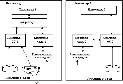 В зависимости от функций, возлагаемых на конкретный компьютер, в его операционной системе может отсутствовать либо клиентская, либо серверная части. На рисунке 1.2 показано взаимодействие сетевых компонентов. Здесь компьютер 1 выполняет роль "чистого" клиента, а компьютер 2 - роль "чистого" сервера, соответственно на первой машине отсутствует серверная часть, а на второй - клиентская. На рисунке отдельно показан компонент клиентской части - редиректор. Именно редиректор перехватывает все запросы, поступающие от приложений, и анализирует их. Если выдан запрос к ресурсу данного компьютера, то он переадресовывается соответствующей подсистеме локальной ОС, если же это запрос к удаленному ресурсу, то он переправляется в сеть. При этом клиентская часть преобразует запрос из локальной формы в сетевой формат и передает его транспортной подсистеме, которая отвечает за доставку сообщений указанному серверу. Серверная часть операционной системы компьютера 2 принимает запрос, преобразует его и передает для выполнения своей локальной ОС. После того, как результат получен, сервер обращается к транспортной подсистеме и направляет ответ клиенту, выдавшему запрос. Клиентская часть преобразует результат в соответствующий формат и адресует его тому приложению, которое выдало запрос.