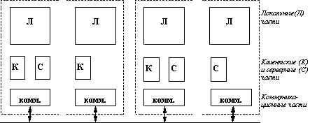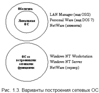 ![]() Рис. 1.2. взаимодействие компонентов операционной системы при взаимодействии компьютеров ![]() На практике сложилось несколько подходов к построению сетевых операционных систем (рисунок 1.3). Первые сетевые ОС представляли собой совокупность существующей локальной ОС и надстроенной над ней сетевой оболочки. При этом в локальную ОС встраивался минимум сетевых функций, необходимых для работы сетевой оболочки, которая выполняла основные сетевые функции. Примером такого подхода является использование на каждой машине сети операционной системы MS DOS (у которой, начиная с ее третьей версии появились такие встроенные функции, как блокировка файлов и записей, необходимые для совместного доступа к файлам). Принцип построения сетевых ОС в виде сетевой оболочки над локальной ОС используется и в современных ОС, таких, например, как LANtastic или Personal Ware. Однако более эффективным представляется путь разработки операционных систем, изначально предназначенных для работы в сети. Сетевые функции у ОС такого типа глубоко встроены в основные модули системы, что обеспечивает их логическую стройность, простоту эксплуатации и модификации, а также высокую производительность. Примером такой ОС является система Windows NT фирмы Microsoft, которая за счет встроенности сетевых средств обеспечивает более высокие показатели производительности и защищенности информации по сравнению с сетевой ОС LAN Manager той же фирмы (совместная разработка с IBM), являющейся надстройкой над локальной операционной системой OS/2. Одноранговые сетевые ОС и ОС с выделенными серверамиВ зависимости от того, как распределены функции между компьютерами сети, сетевые операционные системы, а следовательно, и сети делятся на два класса: одноранговые и двухранговые (рисунок 1.4). Последние чаще называют сетями с выделенными серверами. ![]() а) ![]() б) Рис. 1.4. (а) - Одноранговая сеть, (б) - Двухранговая сеть Если компьютер предоставляет свои ресурсы другим пользователям сети, то он играет роль сервера. При этом компьютер, обращающийся к ресурсам другой машины, является клиентом. Как уже было сказано, компьютер, работающий в сети, может выполнять функции либо клиента, либо сервера, либо совмещать обе эти функции. Если выполнение каких-либо серверных функций является основным назначением компьютера (например, предоставление файлов в общее пользование всем остальным пользователям сети или организация совместного использования факса, или предоставление всем пользователям сети возможности запуска на данном компьютере своих приложений), то такой компьютер называется выделенным сервером. В зависимости от того, какой ресурс сервера является разделяемым, он называется файл-сервером, факс-сервером, принт-сервером, сервером приложений и т.д. Очевидно, что на выделенных серверах желательно устанавливать ОС, специально оптимизированные для выполнения тех или иных серверных функций. Поэтому в сетях с выделенными серверами чаще всего используются сетевые операционные системы, в состав которых входит нескольких вариантов ОС, отличающихся возможностями серверных частей. Например, сетевая ОС Novell NetWare имеет серверный вариант, оптимизированный для работы в качестве файл-сервера, а также варианты оболочек для рабочих станций с различными локальными ОС, причем эти оболочки выполняют исключительно функции кл