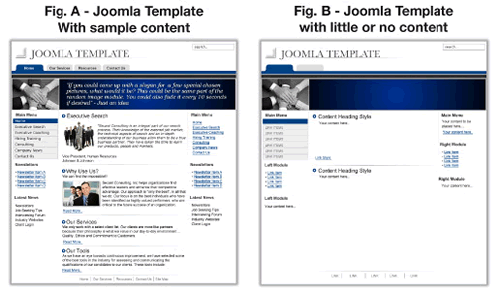 На рисунке 9.1a показан в действии шаблон типовой страницы рабочего сайта. 9.1b демонстрирует тот же шаблон, но либо сразу после установки Joomla либо для страницы с минимумом контента. При размещении на сайте ваш контент наследует из шаблона определенные в нем стили, такие как оформление ссылок, меню, навигация, размер и цвет шрифта и некоторые другие элементы.