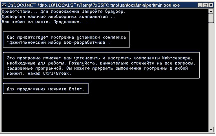 Вас спросят о том, в какой каталог вы хотели бы установить комплекс (по умолчанию используется C:\WebServers, вам нужно лишь нажать Enter, чтобы согласиться с этим выбором). В указанном каталоге будут расположены абсолютно все компоненты системы, и вне его никакие файлы в дальнейшем не создаются (исключая ярлыки на Рабочем столе).