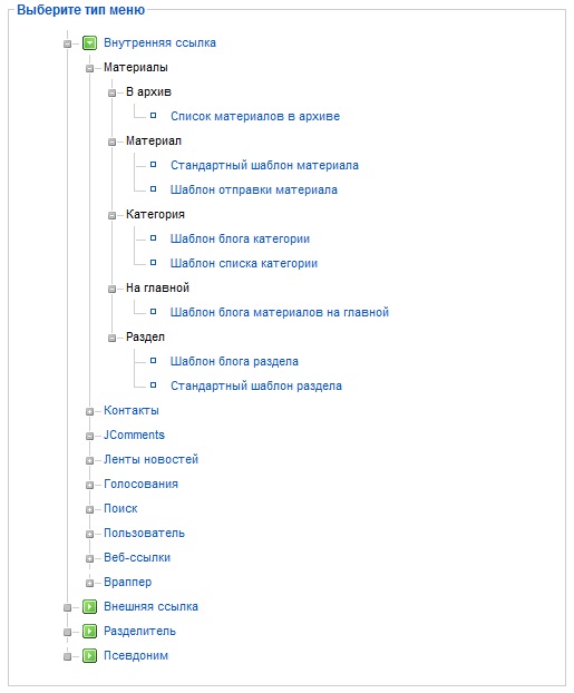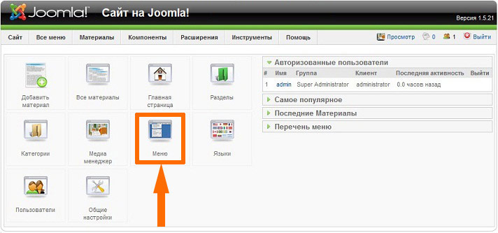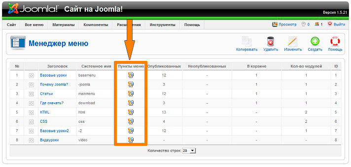 Для создания пунктов меню необходимо в «Менеджере меню» нажать на кнопку «Пункты меню» в одноименном столбце.