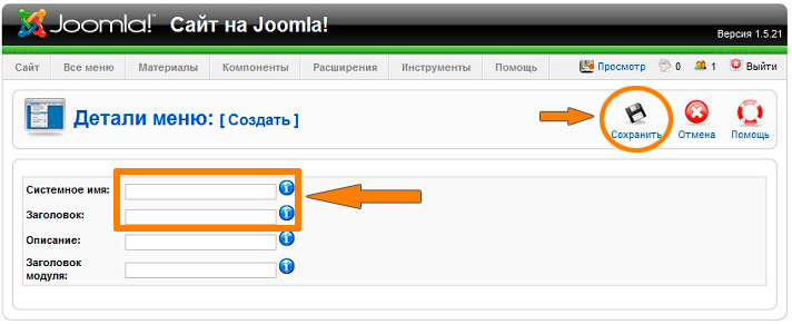 Системное имя (латинским шрифтом), заголовок – имя пункта меню при выводе на сайт.