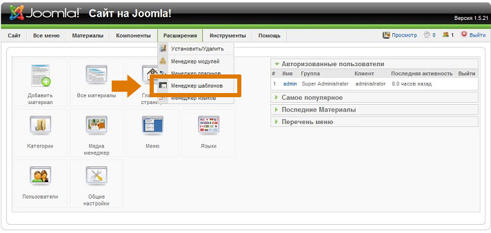 Чтобы установить первый шаблон необходимо с главной панели Joomla перейти на вкладку "Расширенные "и выбрать пункт "Менеджер шаблонов"